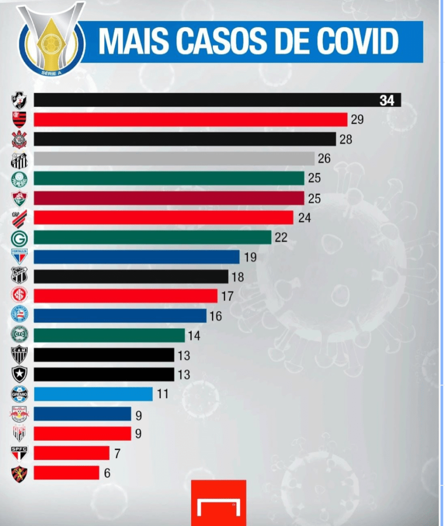 De março de 2020 (começo da pandemia no Brasil) a 25 fevereiro de 2021 (última rodada do Brasileirão), 365 jogadores dos 20 clubes da Série A foram infectados pelo coronavirus – sem contar treinadores e profissionais das comissões técnicas e dirigentes –, segundo levantamento do site Goal, com dados até a 37.ª rodada (penúltima do campeonato).