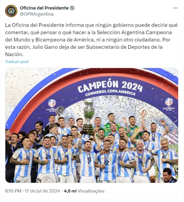 Javier Milei, presidente da Argentina, reagiu de imediato e, pasmem, demitiu o Secretário de Esportes.
