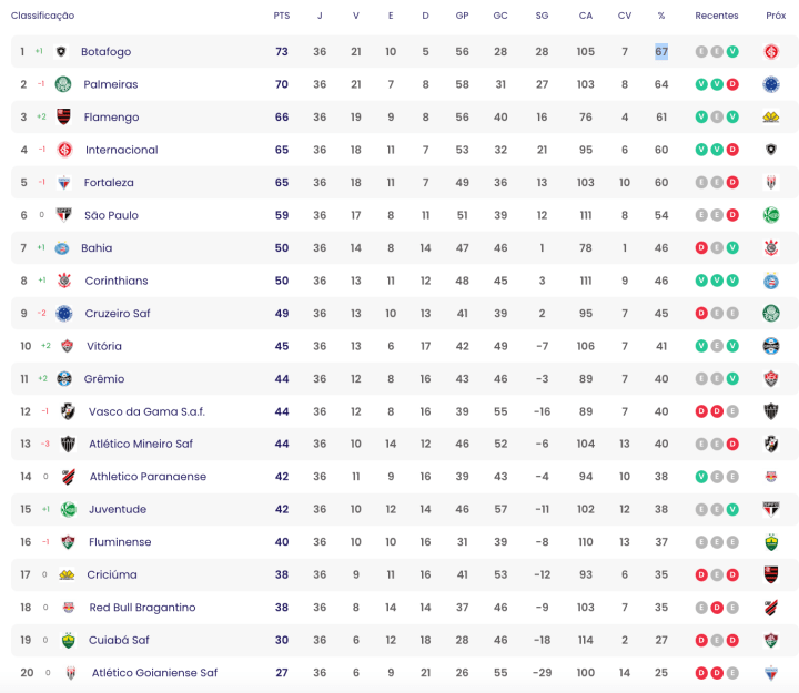 Rebaixamento – Atlético-GO e Cuiabá já caíram. Bragantino e Criciúma aparecem como os mais fortes candidatos a ocupar as duas vagas que restam ao rebaixamento. Athlético-PR, Juventude e Fluminense ainda correm risco.