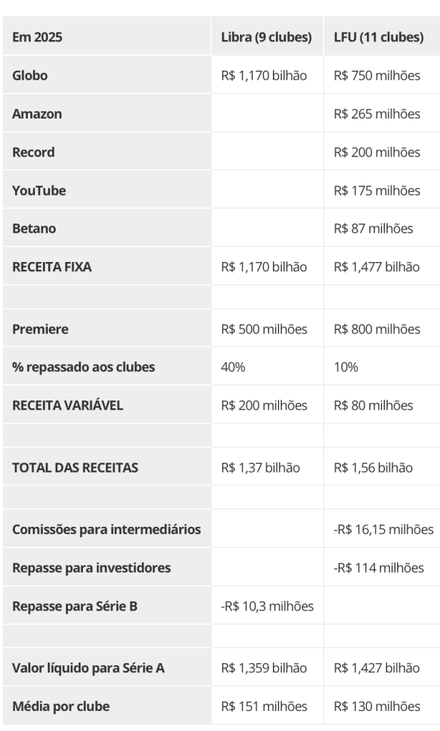 A Libra fecha com a Globo (+ SporTV e Premiere). Vende por R$ 1,1 bilhão pacote de jogos de seus nove clubes da Série A – Atlético-MG, Bahia, Bragantino, Flamengo, Grêmio, Palmeiras, Santos, São Paulo e Vitória. Contrato assinado em março de 2024