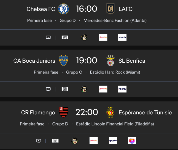 Palmeiras estreia neste domingo (15/6) às 19h e o Botafogo arranca no Mundial às 23h. Amanhã, segunda-feira (16/6), é a vez do Flamengo entrar em campo às 22. Acompanhe: