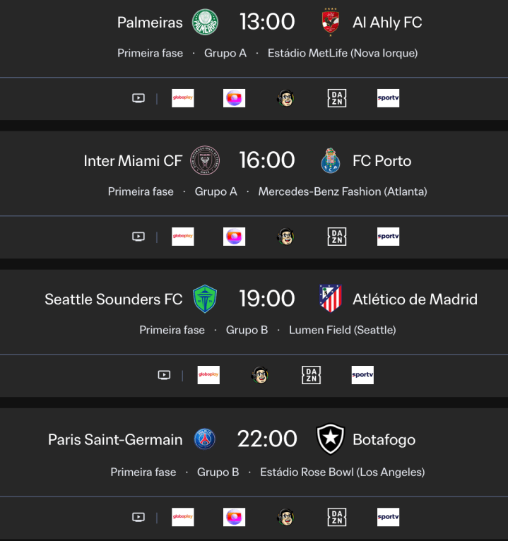13h – Palmeiras x Al Ahly – Globo, Sportv, globoplay e CazéTV (Youtube)