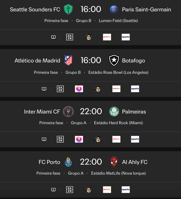16h – Atlético Madrid x Botafogo – Globo, Sportv, globoplay, Cazé TV e Dzan