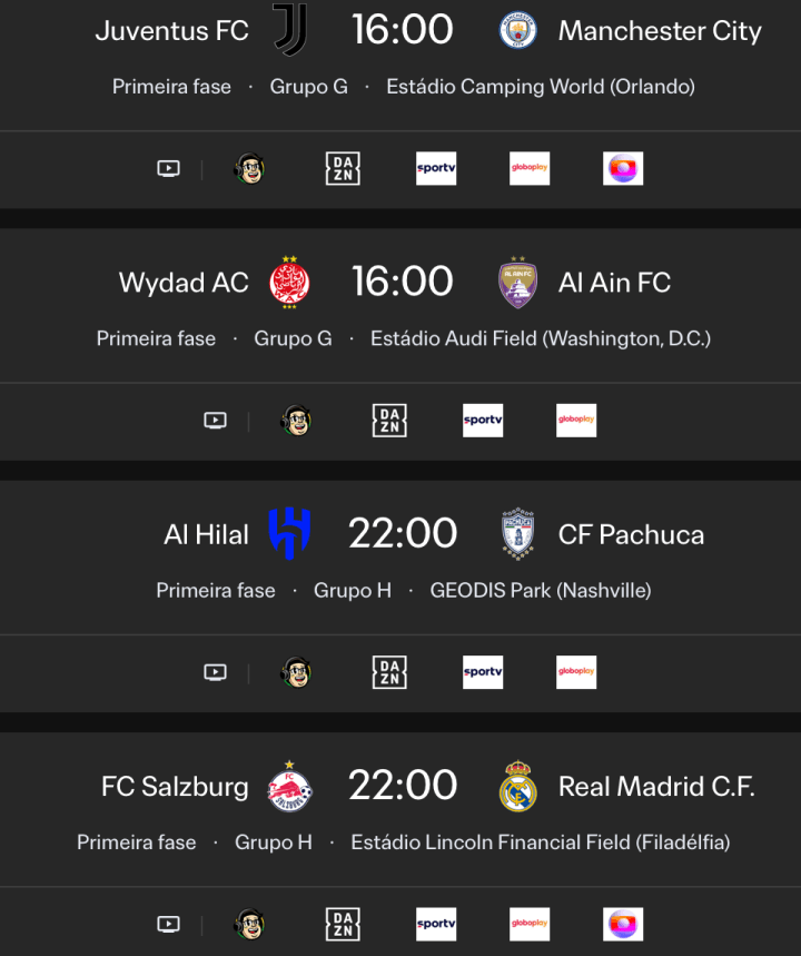 Onde assistir os jogos desta quinta-feira (26/6). Tem Manchester City x Juventus decidindo primeiro lugar do Grupo G e Salzburg x Real Madrid no Grupo H.